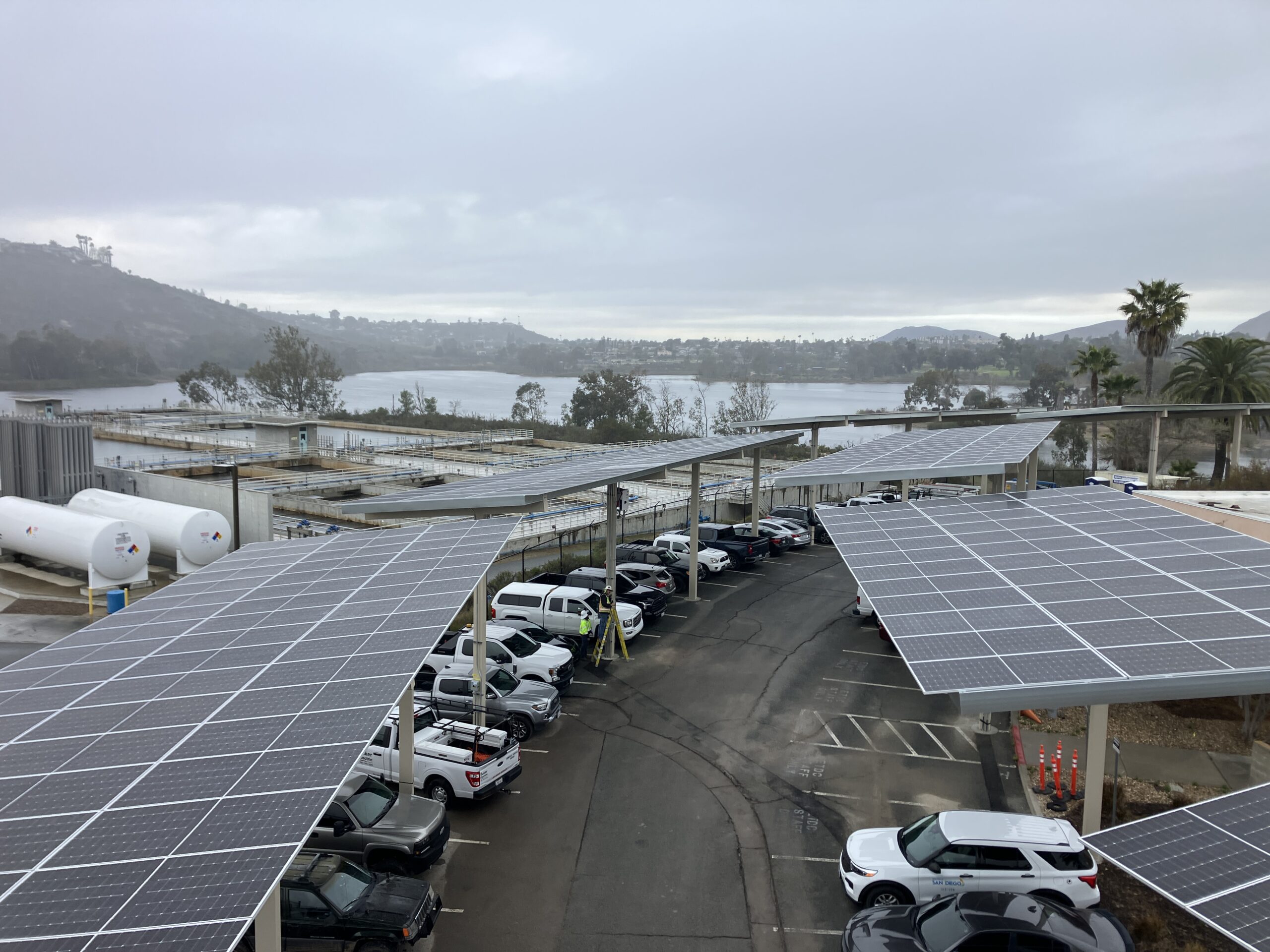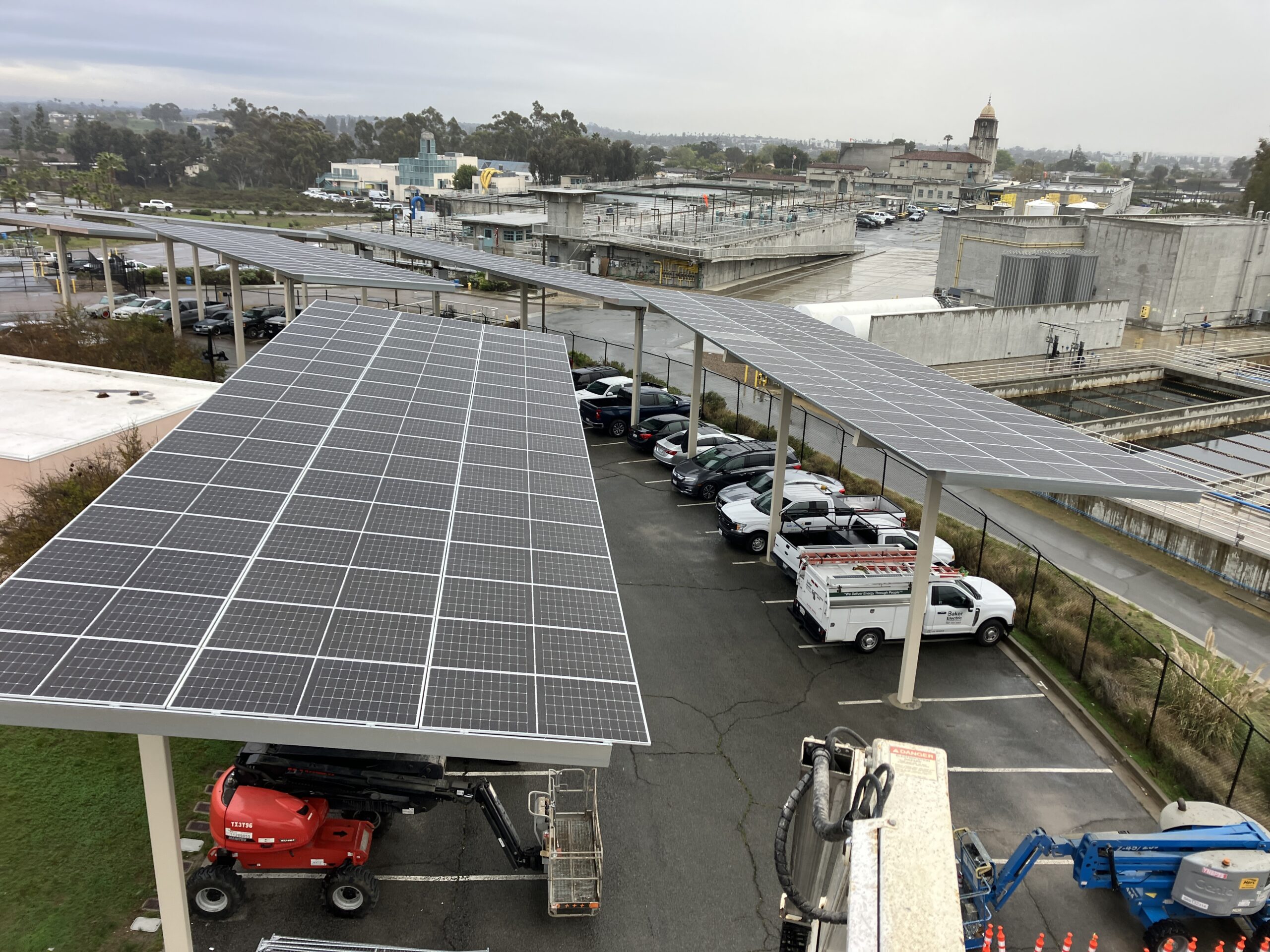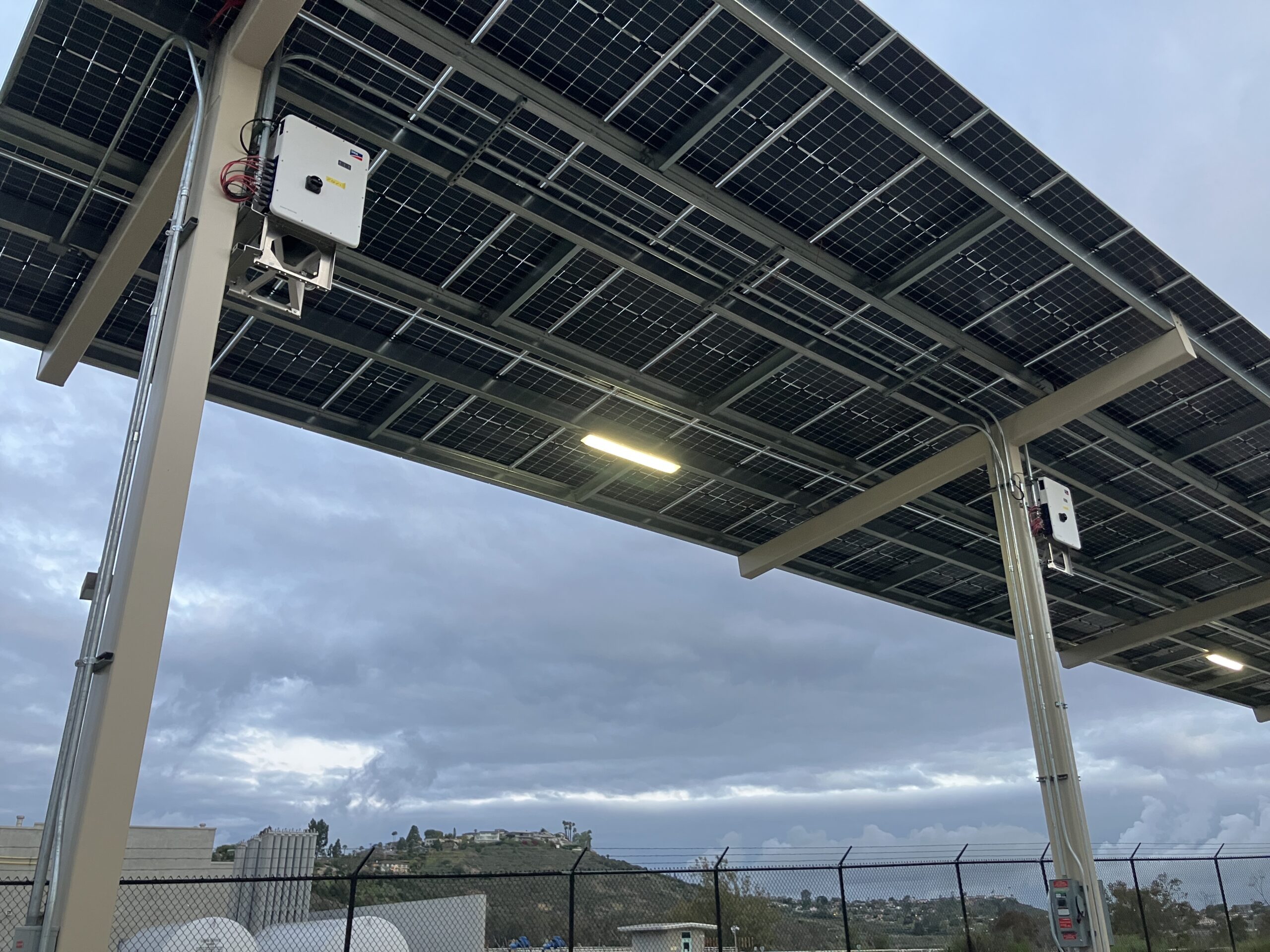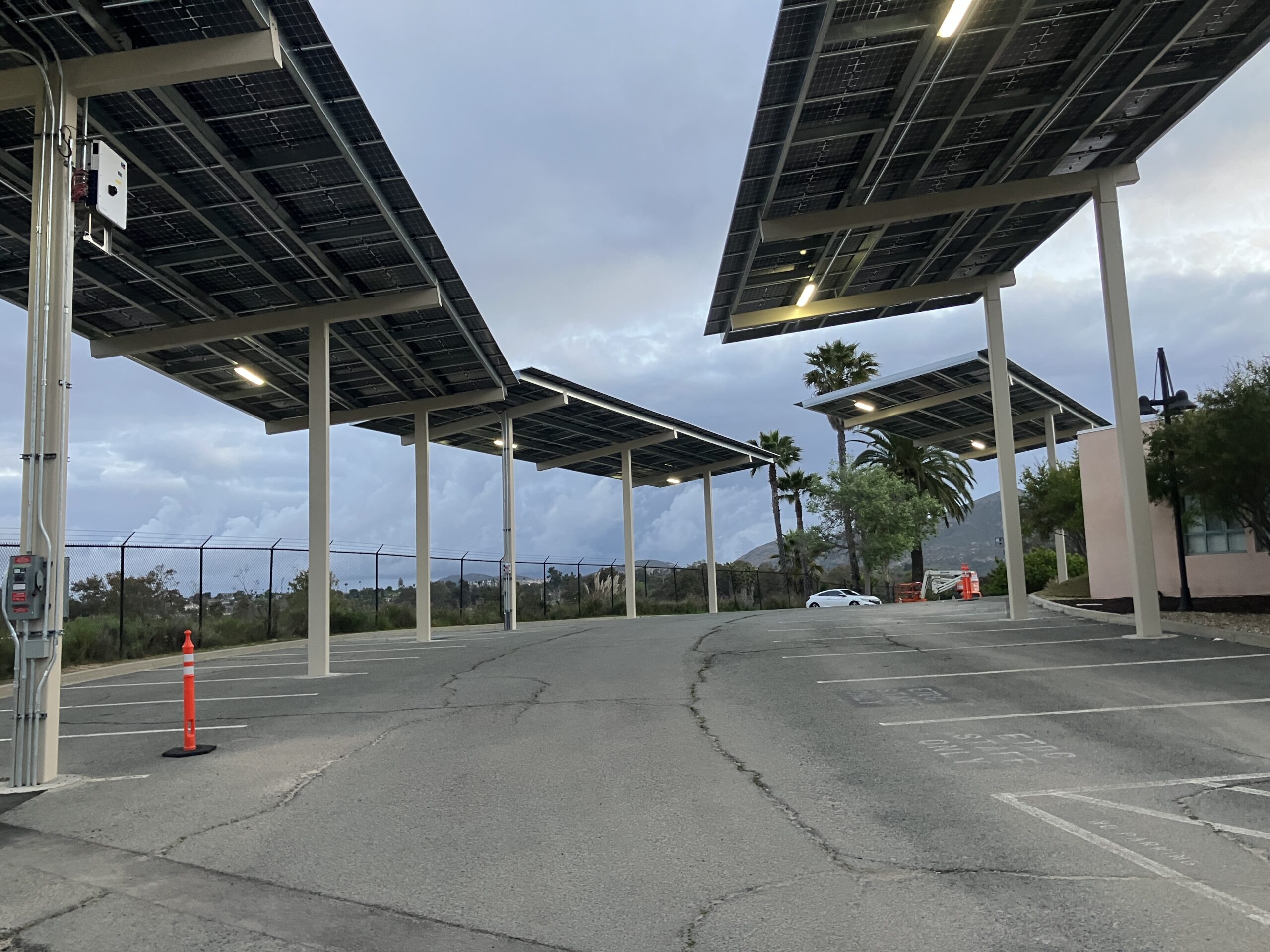 207.36 kWDC (195.8 kWAC) solar photovoltaic power system design on seven new solar canopies in a parking lot located in San Diego, CA.